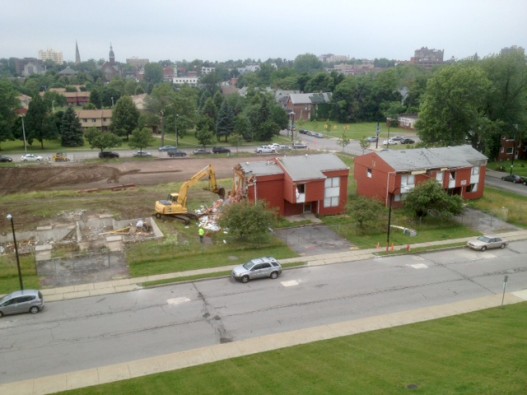The last of the BMHA housing units, known as the Woodson Housing, were demolsihed today. These units were constructed on Fosdick Field in 1977. While occupied by great neighbors, the units themselves were not constructed well and blocked the western approach of the 'School on the Hill' severaly altering its aesthetics. The last of the units had been abandoned since 2009.